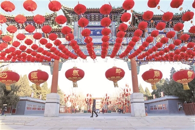 随着春节临近,春联、福字和红灯笼扮靓了京城大街小巷。图为北京地坛公园挂起红灯笼喜迎新春。