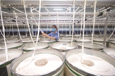 2月11日是春节假期后的第一个工作日,各行各业的劳动者纷纷投入到繁忙的生产当中。图为在山东省青岛市即墨区一家大型纺织企业,纺织工人在机台上忙碌。