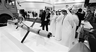 为期5天的第14届阿布扎比国际防务展2月17日在阿联酋首都阿布扎比国家展览中心开幕。中国国家国防科技工业局组织9家军贸公司以“中国军工”国家展团形式参展,展区总面积达1458平方米。图为“中国军工”展团工作人员向参观者介绍展品。新华社发
