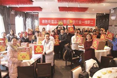 1月24日下午,春节临近,德胜街道总工会一年一度的“慰问餐饮行业一线员工”活动在庆和楼餐饮有限公司举行,德胜街道总工会主席陈洪祥将为餐饮职工准备的金猪礼盒送到参会人员手中。