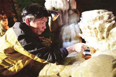 湖南张家界武陵源黄龙洞风景区内,有一群人行走在洞内,专门为钟乳石进行保洁。今年54岁的毛国平就是其中一员。值班期间,他与同事一道在洞内行走,对各游览区的钟乳石进行巡查,及时清理钟乳石上的苔藓、灰尘等。每一个当班日,他在洞内上下的台阶和钟乳石林中行走不少于8万步。洞内工作环境潮湿,一年四季都要穿着外套,毛国平干清洁工近20年来,一直和同事们默默地坚守着。图为毛国平在洞内对钟乳石进行清洁。