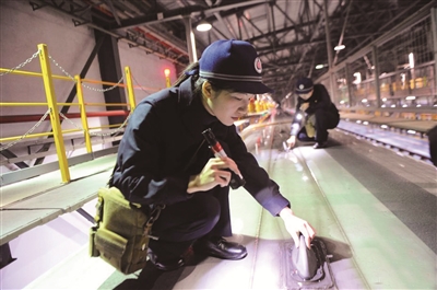 为确保每一列从南宁出发的动车安全运行,中铁南宁局南宁电务段的6名年轻女职工每天深夜都穿梭在停运待检的动车顶上,为动车“擦亮眼睛”“疏通耳朵”。她们被人们称为守护动车“健康”的“女护士”。当列车时速达到200公里以上时,必须依靠被铁路职工亲切地称作“顺风耳”和“千里眼”的机车综合无线通信设备CIR系统来识别行车信号。春运时,车间内晚上需要检测维护的动车基本上保持在30组左右,“女护士”的身影从未缺席。图为职工沈姗姗对动车顶部设备进行检测维护。