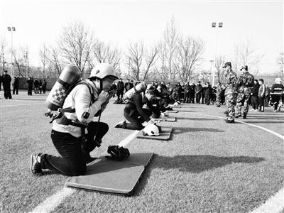 近日,海淀区四季青镇在海淀消防支队组织开展了2019年度微型消防站实战演练大比武。本次比赛共有22支队伍参赛,比赛项目贴近实战,包括一人两盘水带连接操作、佩戴空气呼吸器、穿戴战斗服3个比赛项目。本报记者 周美玉 摄影报道