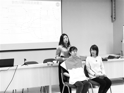 “我老不敢穿颜色鲜艳的衣服,以后我要变换一下风格啦。”一名女职工来到现场时身着黑衣黑裤,在做完老师给出的肤色冷暖简易测量后,她悄声对一旁的同事说。