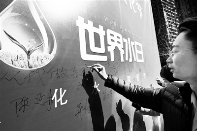 昨天,东城区东直门街道第七届水文化节活动走进了万国城社区。今年的水文化节结合“3·22国际水日”,以“坚持节水优先,强化水资源管理”为主题开展宣传教育活动。活动现场,社区居民分享了节水妙招和保护水资源的心得体会,并在印有“世界水日”字样的背景板上签名,承诺节水爱水。本报记者 于佳 摄影报道