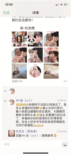 他告诉曲小松,这是小依燃出生后,他们父女俩的第一次近距离接触。看着女儿熟睡的小脸儿,杜骊辰特别激动。他给曲小松发了微信:“医生说她体重1780克了,血项正常,也能吃奶。不出意外的话,再过一两周就能出院!等她长大了,我要告诉她,这辈子都不能忘了救她一命的曲大伯。”