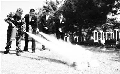 春季气候干燥,是失火的高发期。昨天,河北省三河市消防大队在灵山宝塔陵园实地表演了山地消防演练科目。当天,消防员还和员工一起,在园内搭起了“献花替纸钱”环保宣传岛,劝导前来祭扫的市民树立“绿色祭扫,保护空气清新”的环保理念。本报记者 陈艺 摄影报道