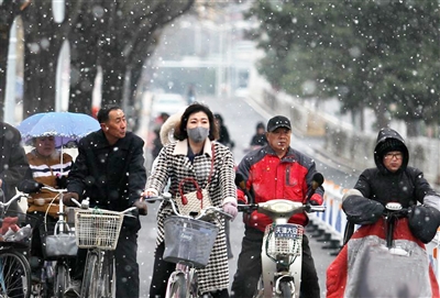 3月28日,北京延庆区的居民在雪中出行。当日,北京市北部延庆区出现降雪天气。