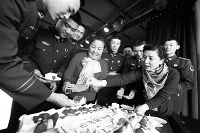 近日,东城区东直门街道为拥军十八载的兵妈妈闫和平举办纪念活动。活动现场,播放了闫和平的事迹短片。已经退伍、来自大江南北的“兵儿子”们和“兵妈妈团”一起合作进行了歌舞、小品等文艺表演。本报记者 边磊 于佳 摄影报道