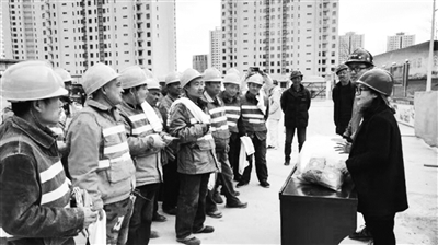 近日,门头沟区总工会劳动争议调解中心工作人员走入辖区在建项目工地——北京矿建建设集团工地向农民工开展普法宣传。工作人员向农民工讲解工作时需要注意的事项,引导他们依法维护自己的合法权益,并发放毛巾、书包等宣传品,激发了农民工群体的学法热情。本报记者 闫长禄 摄影报道
