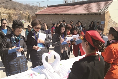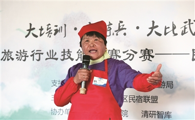 4月3日,在延庆区北方民宿学院,一位头戴厨帽,身穿红色围裙的中年妇女站在讲台上,面带微笑介绍美丽的家乡和特色菜肴。舒心的言谈举止,赢得了台下宾客热烈的掌声。