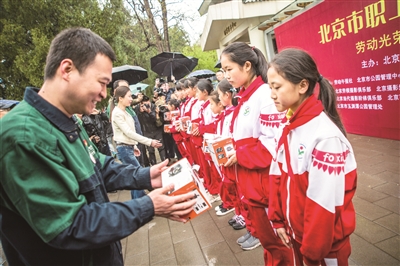 4月9日上午,由北京市总工会和北京摄影家协会联合举办的2019年“劳动光荣·爱国情 奋斗者”北京市职工摄影文化活动月在玉渊潭公园拉开帷幕。作为“把微笑带回家 为最美劳动者点赞”大型公益活动的项目之一,职工摄影文化活动月内容包括主题摄影展、摄影比赛、劳模及职工摄影家采风、专题论坛、特色沙龙等20多项文化活动。现场,市城市照明管理中心华灯班向来自房山区佛子庄中心小学的10名孩子赠送数码相机,标志着“为最美劳动者点赞”大型公益活动首次开展艺术扶贫。(相关报道详见第16版)