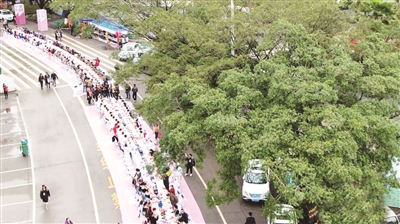 近日,广西柳州市举行千米长桌螺蛳粉宴,长条桌在一个标准体育馆外围成一圈,数千人一同“嗦粉”为乐。