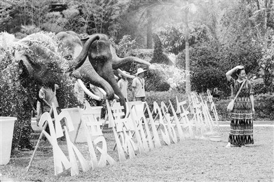 4月14日,在位于云南省西双版纳傣族自治州的野象谷景区,游客参加泼水节活动,庆祝傣历新年。泼水节于每年4月中旬举行,是泰国、柬埔寨和缅甸等东南亚国家和我国云南、广西等地的传统节日活动。人们用相互泼水的方式互送祝福、传递欢乐。 新华社发