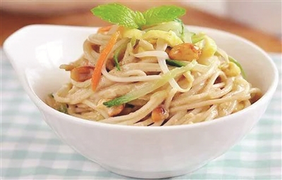 在北京,夏天没有几家不吃芝麻酱凉面的,因为既省事又凉快。北京人吃芝麻酱凉面,必备的有拌好的芝麻酱、花椒油、蒜蓉汁、老陈醋、黄瓜丝,依个人口味还可以备上芝麻盐和水萝卜丝。