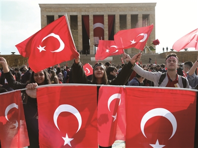 埃尔多安在讲话中回顾了土耳其独立战争史,表示1919年5月19日是土耳其人民抗击外来侵略者、走向民族独立和自由的第一步。埃尔多安号召土耳其人发扬团结精神,到2023年,即土耳其共和国建国100年时实现新的奋斗目标。图为在土耳其安卡拉,人们参观穆斯塔法·凯末尔·阿塔图尔克的陵墓。