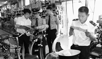 近日,石景山区市场监管局对全区在售电动自行车开展专项检查。对不合格商品责令下架停止销售,并现场开展行政指导,对商家负责人进行法规知识培训,督促商家加强自律,切实维护消费者的合法权益。