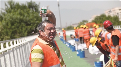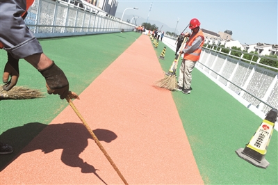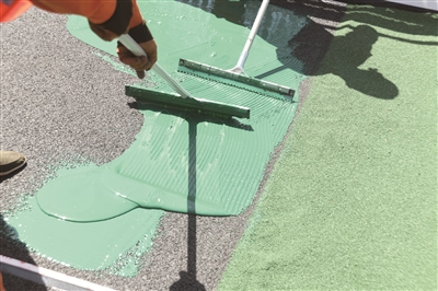 总面积4.2万平方米的彩色道路面层施工,在北京尚属首次,施工工期紧、铺装面积大,成为此次工程的主要难点之一。在铺装中需要使用树脂胶近136吨,彩色陶瓷颗粒245吨,粘结剂和陶瓷颗粒都必须保持色调一致,不能有色差;同时,整个铺装工序要集中在5天的时间内全部完成,这对于材料生产能力、物流供应能力、现场协调存放等方面,都提出了严峻的考验。全体参施人员争分夺秒,克服各种困难,不断在实践中探索,通过优化施工流程、实行精细化管理,从人员配置、材料供应、现场调配等资源管控入手,合理安排平行工序,加强过程管控,将计划11天的工期,优化到5天。