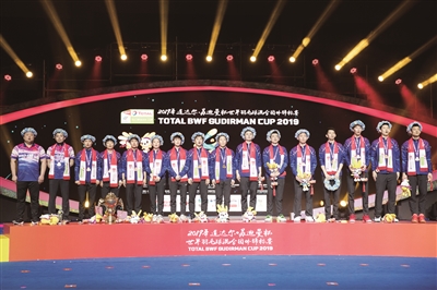 5月26日,在广西南宁举行的2019年苏迪曼杯世界羽毛球混合团体锦标赛决赛中,中国队以3比0的总比分战胜日本队,第11次捧得苏迪曼杯。 新华社发