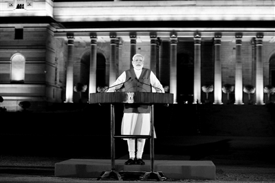印度总统科温德5月25日正式任命莫迪为新总理,同时要求莫迪提名新一届联邦政府内阁成员。莫迪随后发表公开讲话,确认将开启他的第二个总理任期,表示“新政府将努力实现所有人的梦想,不辜负人们的期望”。图为印度总理莫迪在新德里向媒体发表讲话。