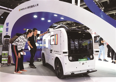 5月28日,观众在交易会主会场观看展出的自动驾驶无人车。当日,2019年中国国际服务贸易交易会(京交会)在北京开幕。(相关报道详见第10版)