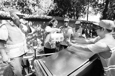 连日来,北京持续高温天气。22日,丰台区南苑街道红房子社区工作者走进大街小巷为辖区一线环境卫生保洁员送去绿豆汤、西瓜等防暑降温慰问品,让他们在炎热夏季感受一份清凉,同时对他们在高温下的工作表示感谢。本报记者 陈艺 通讯员 史莉 摄影报道