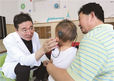 近日,在北京市通州区人工耳蜗培训学校,北大医院耳科专家刘玉和教授(左)在为接受耳蜗植入术后康复的听障儿童做检查。当日,以“爱久·久爱 让爱延续”为主题的庆“六一”活动在北京市通州区人工耳蜗培训学校举行。北大医院耳鼻喉科听力团队免费为孩子们提供声导抗、耳波发射等项目的检查。