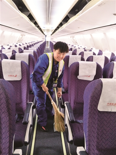 此前,谷学美在一家私人超市上班,每天的工作就是理货,月工资大约2000多元。现在,她成了机场的客舱保洁,每天为来来往往的客机服务,以保障机舱内的卫生整洁。“换了工作,我的工资直接翻番儿了,而且五险一金都有,我特别知足。”她高兴地说。
