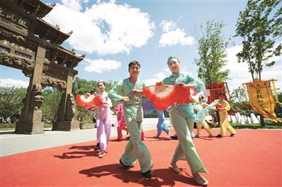 6月9日,演员在安徽园入口处表演花鼓灯《夫妻观灯》。当日,2019年中国北京世界园艺博览会“安徽日”活动在北京世园会园区举行。