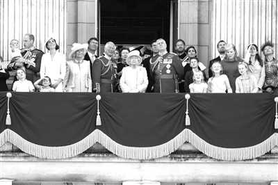6月8日,在英国伦敦,英女王伊丽莎白二世(中)和王室成员在白金汉宫阳台上庆祝女王生日。当日,英国伦敦举行盛大庆典,庆祝英女王93岁官方生日。