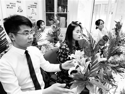 13日,朝阳区大屯街道慧忠里第二社区联合工会举办职工插花活动,聘请专业老师为职工讲授插花技巧。此次活动共有40名辖区内企业职工参与。现场,花艺师给职工讲授如何插花,职工边学边操作。很快,一个个插花作品呈现在大家面前。本报记者 刘欣欣 摄影报道