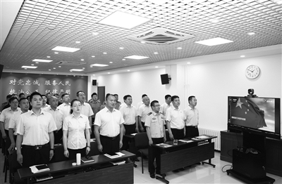 近日,海淀保安分公司党支部用党建引领保安队伍建设,落实“三会一课”制度,持续开展“不忘初心、牢记使命”主题教育系列活动,公司党支部书记刘澎为全体党员上党课,提升党员队伍的政治素养,在保安服务工作中发挥先锋模范作用。图为党课前,全体党员合唱《没有共产党就没有新中国》。本报记者 赵思远