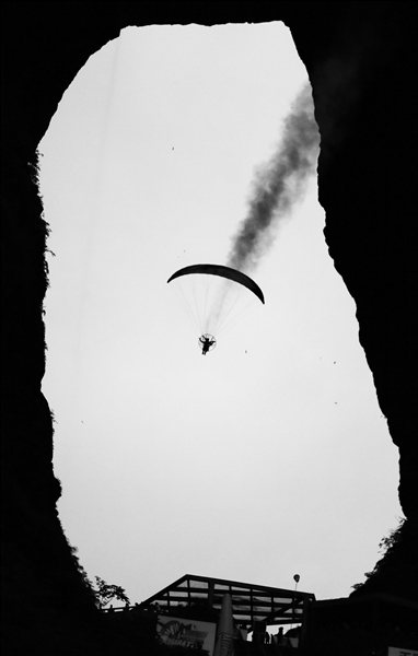 6月29日,选手在穿越天门洞竞速赛中竞技。当日,“极限飞荡”张家界天门山动力伞特技国际大师赛在湖南张家界天门山景区举行穿越天门洞竞速赛,来自美国、西班牙、巴西、希腊、阿联酋等国的7名选手竞相“穿越天门”。