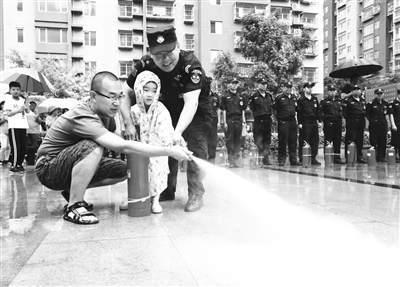 近日,丰台区南苑街道组织开展了主题为“防风险、除隐患、遏事故”的安全生产活动。活动中,消防支队驻街消防员、专职安全员、物业工作人员等分别教居民灭火器使用方法,带领居民演练应急疏散逃生等,进一步提高居民群众的安全意识,提高自救互救能力。本报记者 陈艺 摄影报道