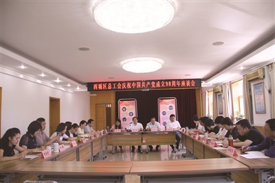 7月1日,在党的生日这天,西城区总工会召开庆祝中国共产党成立98周年座谈会。参加此次座谈会的有党员领导干部、机关党委委员、党支部委员、十佳党员、各部室及事业单位负责人。区总工会副主席林育才主持座谈会。