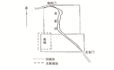 今北京长河主要指昆明湖—京密引水渠—紫竹院—什刹海河道,在元代以前谓之高粱河,曾为永定河故道。历史上永定河善淤、善决、善徙,俗称无定河,魏晋时期永定河自石景山附近向东流经高粱河,其后永定河向南偏移,原故道遗址即形成了高粱河。当时高粱河的源头位于今紫竹院,东流至今德胜门,经什刹海、中南海,流向东南,于今马驹桥处汇入凉水河。《水经注》记载高梁水:“出蓟城西北平地泉,东注,经燕王陵北又东经蓟城北,又东南流”(如图1所示)。《魏氏土地论》也记载:“蓟东一十里有高梁之水者,其水又东南入湿水也。”