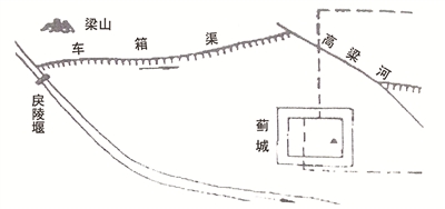 对高粱河的开发利用最早可追溯到三国曹魏时期。由于向南迁移后的永定河与高粱河同为东南流向,永定河水势凶猛时常泛滥,而高粱河则水源匮乏、水量不足。时驻广阳的曹魏征北将军刘靖在此屯垦戍边,为解决永定河水患和军队屯田之需,曾“登梁山以观源流,相湿水以度形势”,命令士兵在永定河石景山附近修建了一座障水的戾陵堰,并于左岸岩石开凿成矩形引渠,向东引至紫竹院贯通高粱河,其间流域灌溉二十多万亩粮田。因渠道类似车箱矩形,遂称之为“车箱渠”,这也是北京最早的大规模引水工程(如图2所示)。史载:“以嘉平二年,立遏于水,导高粱河,造戾陵遏,开车箱渠,灌田岁二千顷。”在其后几百年中,这一水利工程历经多次维修扩建,灌溉面积不断扩大,高粱河水系也由此逐渐形成。