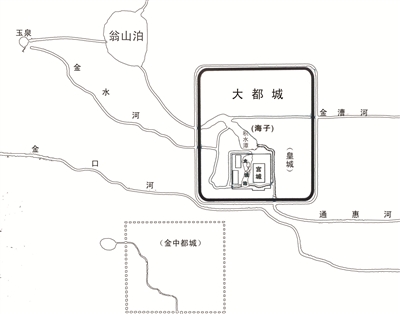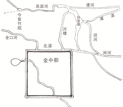 辽宋时期,石敬瑭割让燕云十六州给契丹,此时幽州地区属辽国,为夺取燕云十六州,宋太宗率兵攻幽州。辽宋大军于今高粱河畔会战,最终宋军溃败,直接造成了日后北宋连战连败的局面,此战也成为辽宋关系的重要转折点。据《辽史景宗纪》载:“秋七月癸未。(耶律)沙等及宋兵战于高粱河,少却;休哥、斜轸横击,大破之。宋主仅以身免,至涿州,窃乘驴车遁去。”金灭辽后,金在高粱河西北原辽南京基础上建立中都城。自此,高粱河的功能由单纯的引水灌溉转向运输及城市用水等综合性功能转变。中都城建立后,城市人口增长迅速,粮食物资需求加大,为解决漕运,金在城北护城河以东开凿闸河,并以永定河为水源,但因永定河含沙量大,“积滓成浅,不能胜舟”,最终造成闸河淤塞。公元1205年,金又从玉泉山流泉下游的瓮山泊开渠引水至高粱河,并以高粱河的下游湖泊白莲潭与闸河相接,以济漕运,但终因水量有限,闸河也难免浅滞。据《金史》载:“故为闸以节高良河、白莲潭诸水,以通山东、河北……其溯流而至通州,由通州入闸,十余日而后至于京师。”这是高粱河接济漕运的首次尝试,也是北京近郊水系的一次重要改变。金时,高粱河下游白莲潭是一片天然湖泊,水域辽阔、风光旖旎、景色秀丽。金利用这片水泊扩浚筑岛修建琼华岛,营造了众多的园林宫殿、亭台楼阁,作为金朝皇家游幸娱乐的离宫别苑。白莲潭即为今什刹海、北海和中海水域。这片水泊和宫苑后来成为元大都城建立的依托,对北京城的发展产生了深远的影响(如图3所示)。