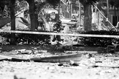 美国东南部佛罗里达州普兰泰申市一家购物中心7月6日发生燃气爆炸,当地警方说约20人受伤,其中2人重伤。图为一名消防员在购物中心爆炸现场工作。
