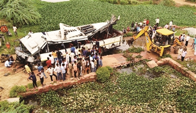 印度北方邦阿格拉市附近7月8日发生一起交通事故,造成至少27人死亡、多人受伤。这是7月8日在印度阿格拉市附近拍摄的事故现场。 新华社发