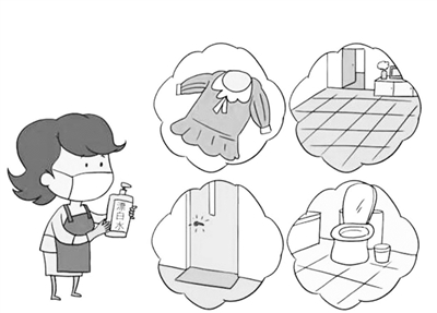 厕所马桶可倒入足量的含氯消毒液(有效氯浓度为5000毫克/升-10000毫克/升),作用30分钟以上。清洁中使用的拖把、抹布等工具以及盛放污染物的容器等都必须用含有效氯5000毫克/升的消毒液浸泡30分钟后彻底冲洗,才可再次使用。集体单位打扫厕所和卫生间的拖把应专用。