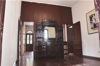 我们来到梅园,顺着山道来到天心台,台前耸立三峰酷似“福、禄、寿”三字的太湖石,故又称“三星石”。翻过小山坡,平地上一座半身青铜像跃入眼帘,荣德生左手抱胸、右手托下巴,凝聚着眉头似有所思。他身后是一幢青砖民国建筑,门楣上书“香海别墅”,穿过前厅,后面有组建筑“诵豳堂”,它面阔九间,中三间为正厅,整个房屋以楠木为梁,称楠木厅。相传,荣德生常在此诵读《诗经·豳风》,故取堂名为“诵豳堂”。堂内陈设均为荣家原物,红木家具、名人书画、玉石挂屏,古朴雅致,堂前檐悬挂“湖山第一”匾。