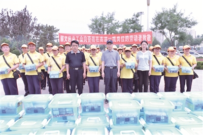 北京天竺综合保税区工会:投入4.9万余元,购买987份防暑降温物品,发放到辖区内7个下属基层工会的职工手中。