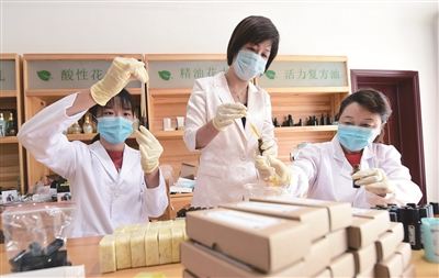 村里还建设了制皂车间,请来了专家万菊兰教村民加工手工皂。两位专家常年驻村,近两年来,培养出一批技术能人和小村工匠。村民郝秀萍就是一名“半路”工匠。