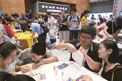昨天是中国传统节日七夕节,为落实市商务局发布的繁荣“夜经济”13条措施,首都博物馆特别增设晚场,通过延长闭馆时间,让观众在博物馆中度过了一个特别的七夕夜。同时,首都博物馆还策划了一系列以馆藏精品中爱情元素为切入点的创意主题活动。民俗、玉器和瓷器展厅为观众奉献七夕乞巧民俗讲解,带领观众赏析馆藏爱情寓意文物;以馆藏玉器“白玉鸳鸯柄圆盒”为创作灵感,让100对预约情侣夫妻在礼仪大堂同心协力创作“鸳鸯和合”彩沙绘画。