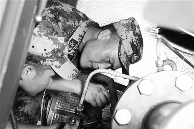 2009年,部队在云南某地演习。当时担任司泵员的吴勇检查装备时发现,泵机突然趴窝。