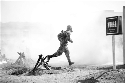 图为在“国际军事比赛-2019”“安全环境”项目单组赛中,中国参赛队员通过火障(8月8日摄)。
