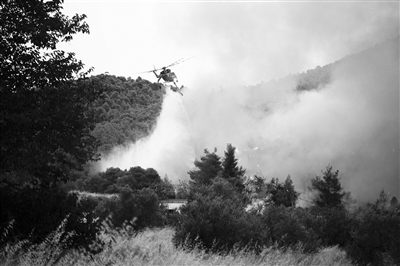 8月13日,在希腊中部埃维亚岛的马克里马利村,直升机参与灭火。埃维亚岛13日凌晨发生森林火灾,火势迅速蔓延。目前已有数百名居民被疏散,当地已宣布进入紧急状态。 新华社发