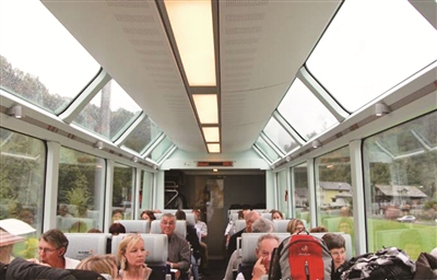 在瑞士坐火车,最惬意的莫过欣赏美景,伯尔尼、日内瓦、卢塞恩等城市的火车都有全景透明旅游专列,如从南部城市采尔马特始发,直达东部小城圣莫里茨的冰川路线全景旅游列车,时速25公里,穿越近300座桥梁,90多个隧道,沿途雪山晶莹、森林碧翠、山谷幽静、牧场安恬,确是一次游走美丽壮观天然画廊的享受。