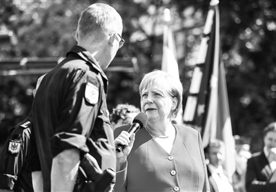 德国联邦政府8月17日至18日举办开放日活动,包括总理府在内的多个政府部门对公众开放,通过多种活动向民众介绍各自的历史、现状及职能。图为8月18日,在德国首都柏林,德国总理默克尔(右)与一名警察交流。新华社发